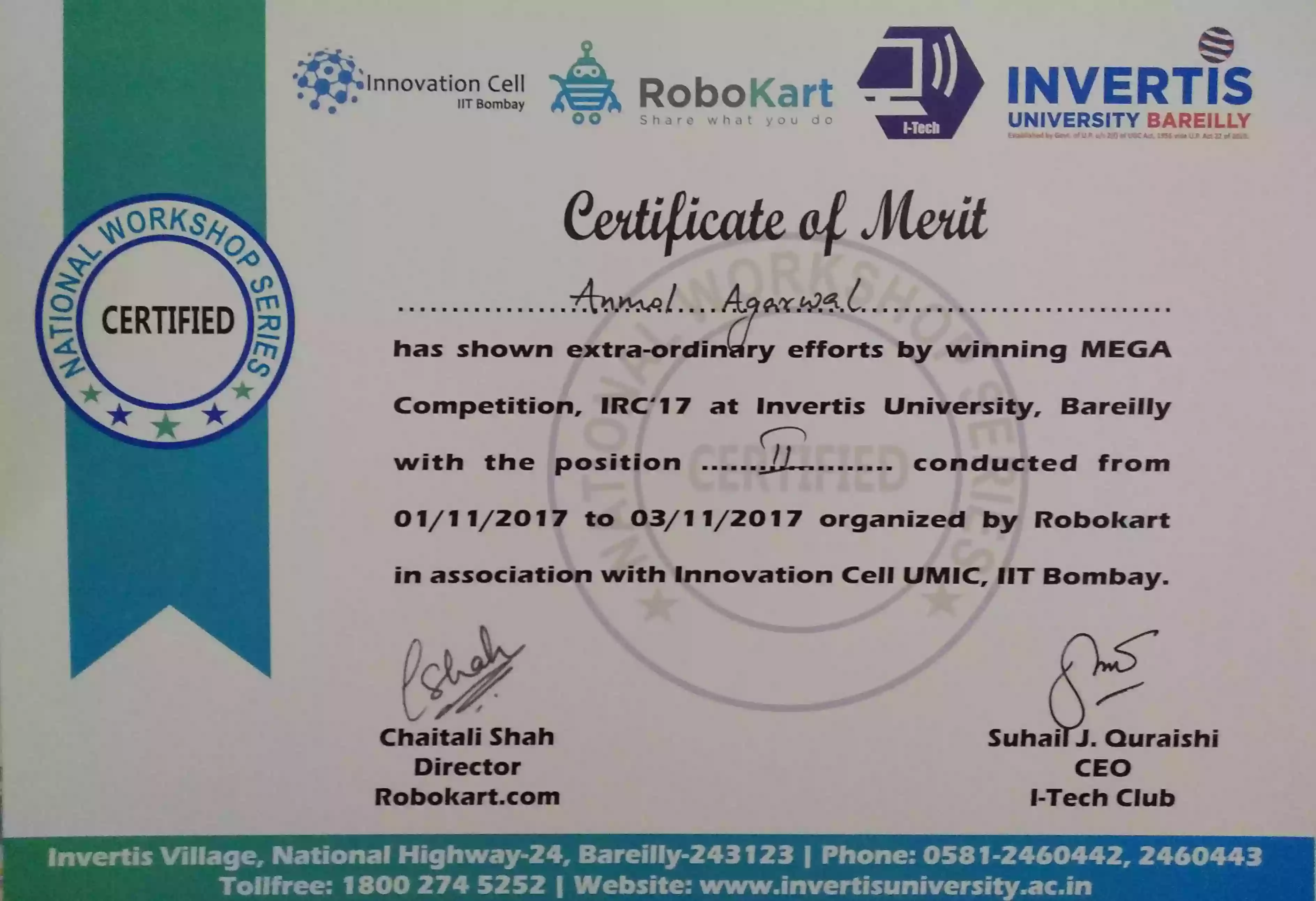 Runner Up - IRC by Innovation Cell IIT Bombay - 2017